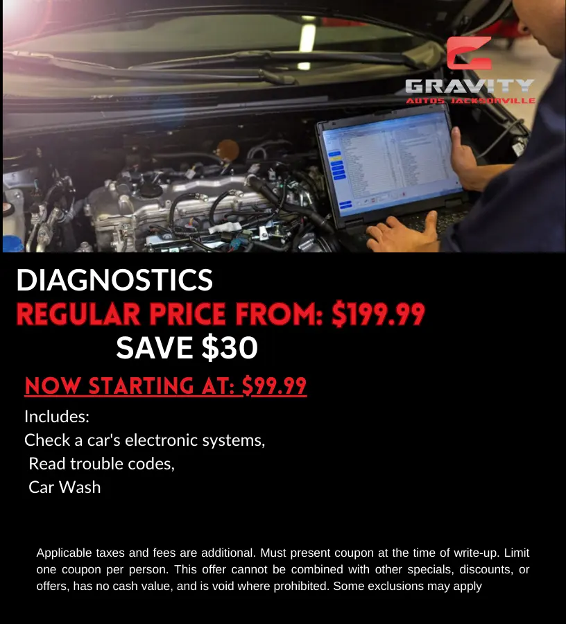Valid on most 4-cylinder gas engines at Gravity Autos Jacksonville. Pices for some vehicles may be slightly higher due to labor and/or materials. Applicable taxes and fees are additional. Must present coupon at the time of write-up. Limit one coupon per person.